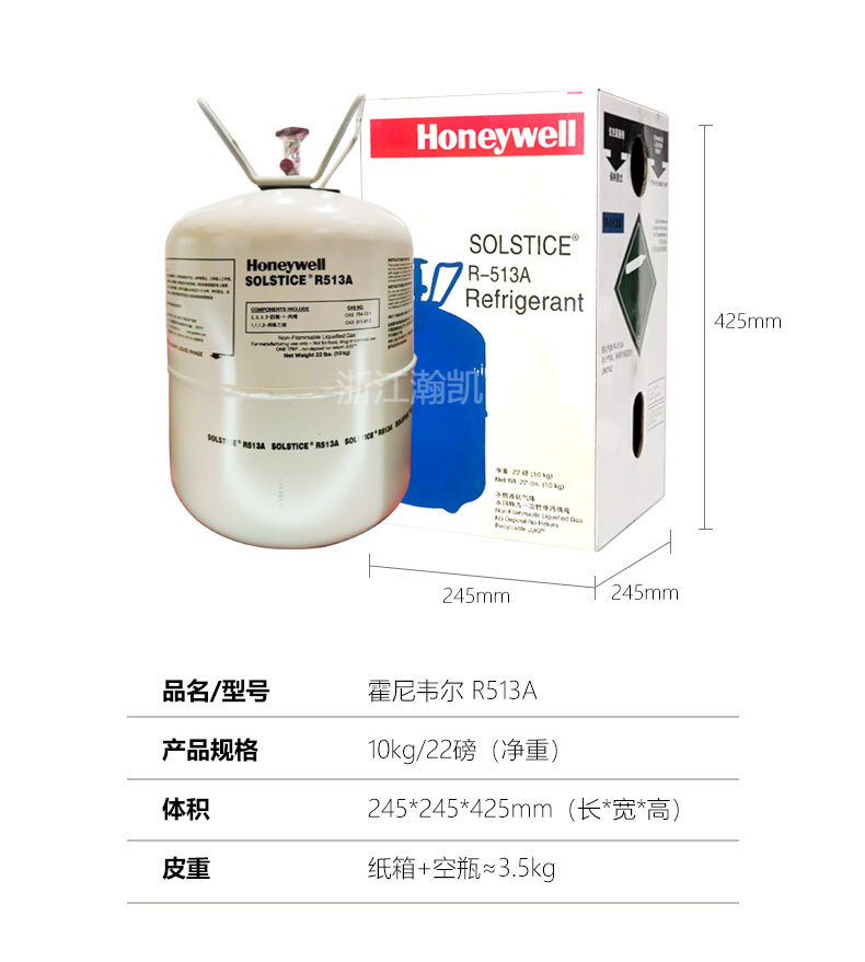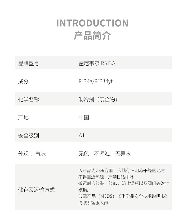 霍尼韋爾R513A制冷劑鋼瓶為帶壓容器,儲存時應遠離火種、熱源、避免陽光直接曝曬,通常儲放于陰涼、干燥和通風的倉庫內;搬運時應輕裝、輕卸,防止鋼瓶以及閥門等附件破損。